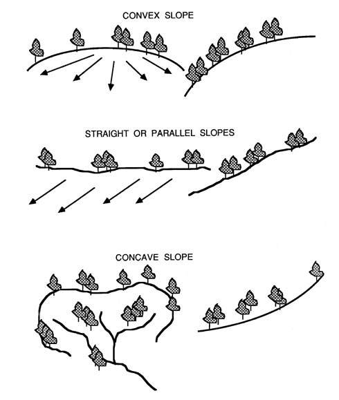 Hillslope geomorphology and hydrologic factors are important considerations in the location, design, and construction of a road. Slope morphology impacts road drainage and ultimately road stability. Important factors are slope shape, slope gradient, slope length, stream drainage characteristics, depth to bedrock, bedrock characteristics, and soil texture and permeability. Slope shape gives an indication of surface and subsurface water concentration or dispersion. Convex slopes will tend to disperse water as it moves downhill. Straight slopes concentrate water on the lower slopes and contribute to the buildup of hydrostatic pressure. Concave slopes typically exhibit swales and draws. Water in these areas is concentrated at the lowest point on the slope and therefore represents the least desirable location for a road.