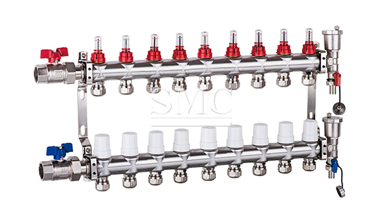 Standard type: The structure of the standard type manifold is the same as the basic type, except that the ball valves on each main pipe are replaced by flow control valves. Replace the manual exhaust valves on the two main pipes with automatic exhaust valves. The standard sub-catchment can precisely adjust the flow of each loop, and even the flow adjustment of the luxurious standard sub-catchment can be adjusted by artificial intelligence.
