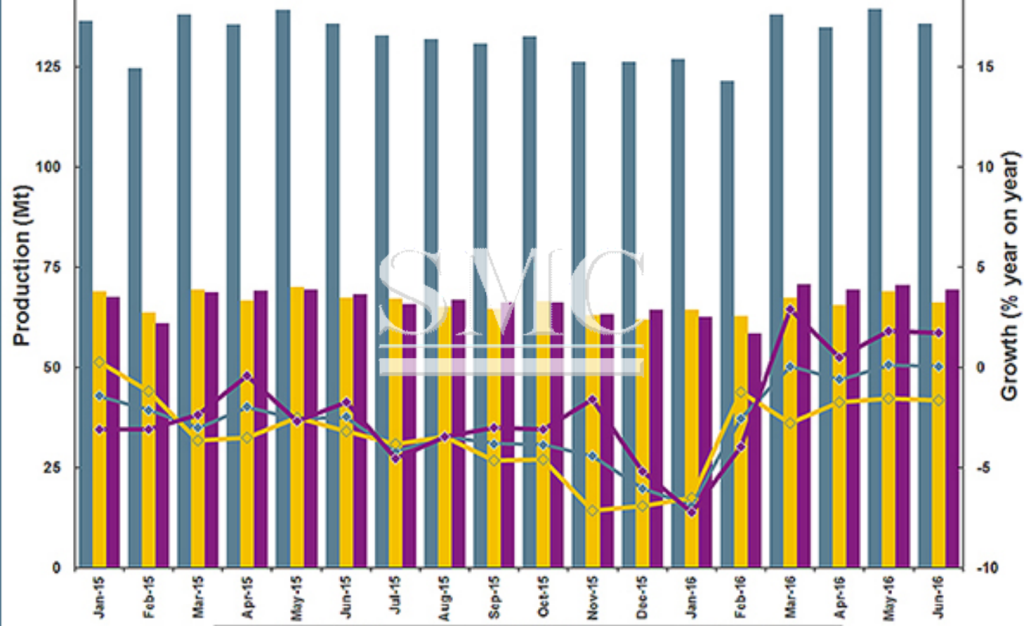 With overall demand declining in the Chinese market and other factors at work to restrain overcapacity, the Chinese steel industry has produced 1.1% less raw steel this year than during the comparable January-June period of 2015.