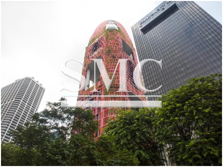 Constructed with concrete, steel and glass, a bold red aluminum façade provides a contrast to the greenery embedded within the building, with four gardens incorporated within the design to ensure the building is suitably cooled.