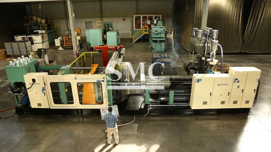 The Pallateer system for this customer included variable frequency hydraulics and other state-of-the-art machinery features. It uses a structural-foam injection method for high specific strength and works well with 100% recycled material, including granulated flake. The system comes with full automation, molds, pallet-transport systems, nitrogen generation, material blending and loading equipment, mold chilling and other options, explained Wilmington Machinery.