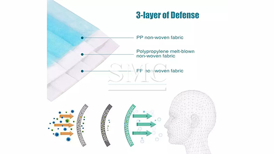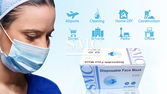 SMC Face Masks are constructed from soft materials to protect against irritation and scratching. Flat ear loop offers maximum comfort, protection, and ease-of-use. The 3-ply construction with soft, fluid-resistant, non-woven outer layers and highly absorbent inner layers protect against pollen, dust, and additional free radicals. Each mask provides very low resistance to breathing. The strong ear loops secure mask without irritating skin and the flexible nose bar enclosed by non-woven material ensures perfect seal and fit. Masks are hypoallergenic, latex, fiberglass-free.
