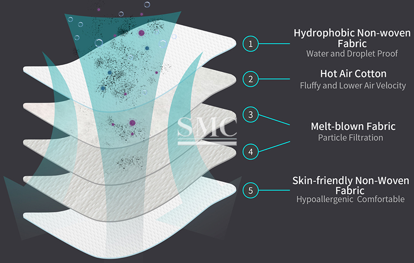 All of face masks are made of high performance PP non-woven fabric, melt-blown fabric, high quality nose bridge and ear loop. The 5 layers construction offer more protection than a standard disposable 3-Ply mask Each mask provides very low resistance to breathing. Masks are hypoallergenic, latex, fiberglass-free.