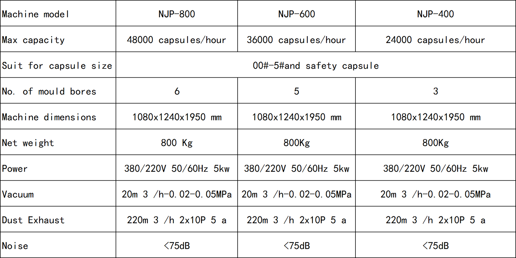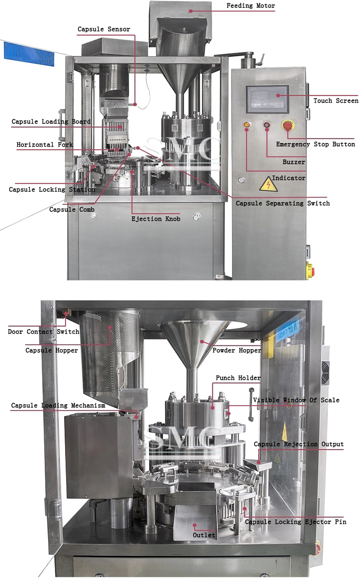 NJP-400 / 600/ 800 adopt PLC control system, human-machine interface, when running malfunction or lack of stuff, automatic alarm, malfunction display, automatic dismiss alarm. And with functions of password setup, touching screen display, automatic parameter setup, data printing, reset, etc. The jump-start axed, cam and other main damageable parts all adopt imported materials. And the machine is suitable for Powder, Granular and Pellet filling, one hour for 12,000/24,000capsules, special for Capsule size from 00# to 5#.