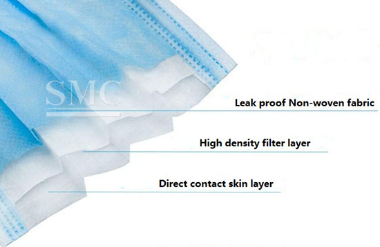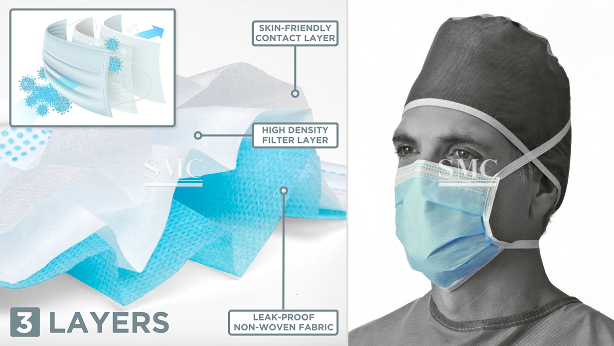 SMC disposable surgical face masks are made of high performance PP non-woven fabric, melt-blown fabric, high quality nose bridge and ear loop. The 3-ply construction can effectively prevent blood spatter during the operation and protect the safety of surgeon. Each mask provides very low resistance to breathing. Masks are hypoallergenic, latex, fiberglass-free.