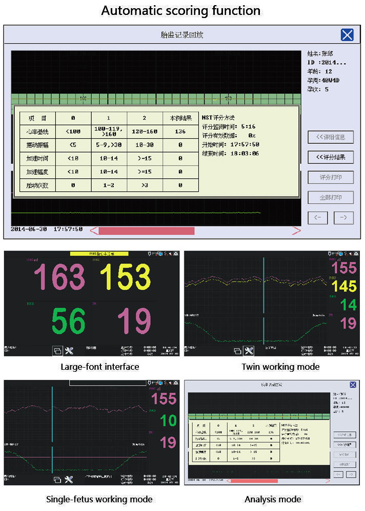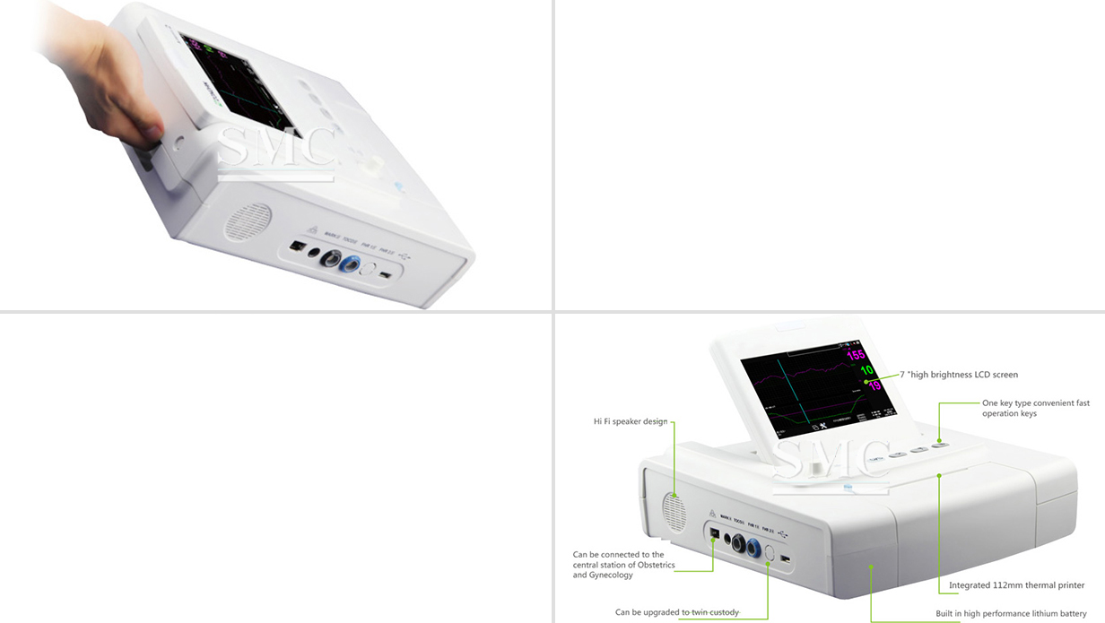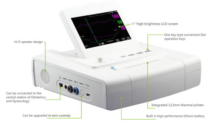 The fetal monitor provides continuous monitoring, display and recording of the fetal heart rate (FHR), and tests and monitors the prenatal uterine function (UA). Detection principle: According to the principle of ultrasound Doppler and the change of fetal cardiac current, the main structure with fetal heart rate recorder and uterine contraction recorder can describe the fetal heart activity pattern measuring instrument.